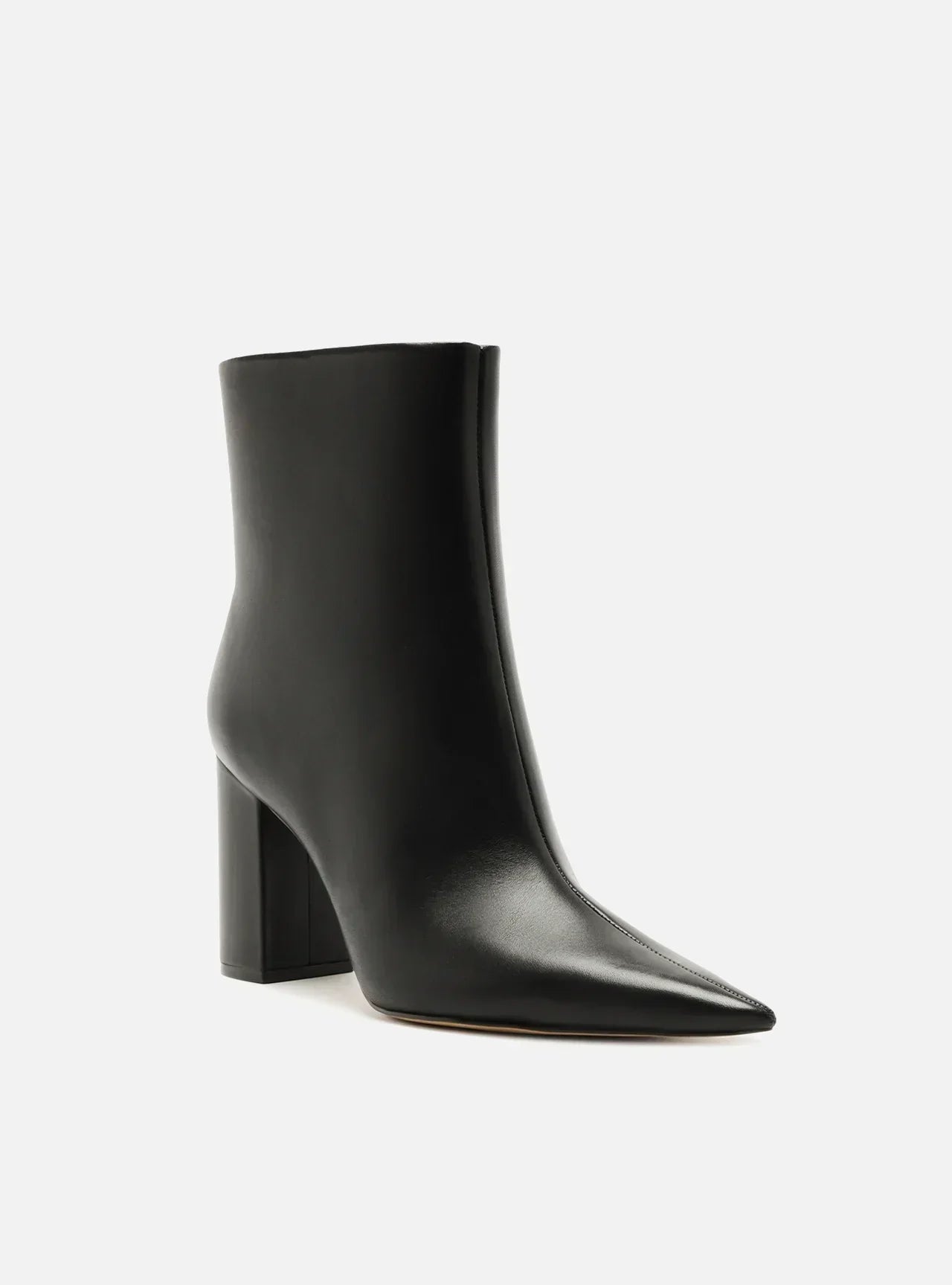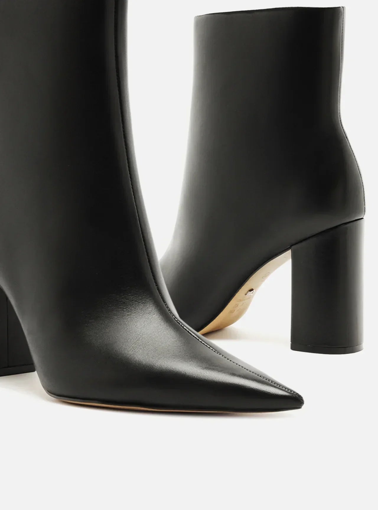 Descrição: Bota feminina marrom de couro. O sapato tem cano curto, salto alto bloco e ponta fina. Traz cabedal ajustado ao pé e fecho em zíper na lateral interna do cano.