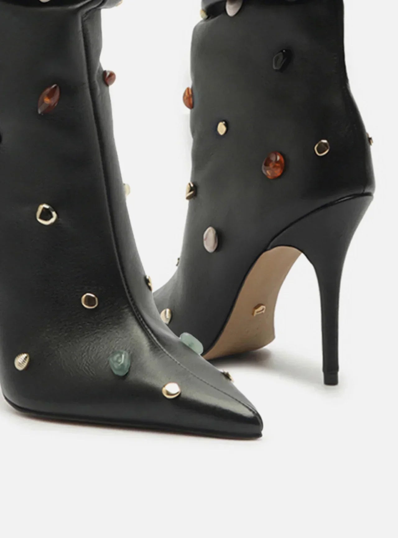 Descrição: Bota preta de couro. O sapato tem cano longo com efeito amassado, salto alto fino e ponta fina. Traz cabedal ajustado ao pé e aplicação de pedras coloridas e metais por todo o cano. Não possui fechamento.