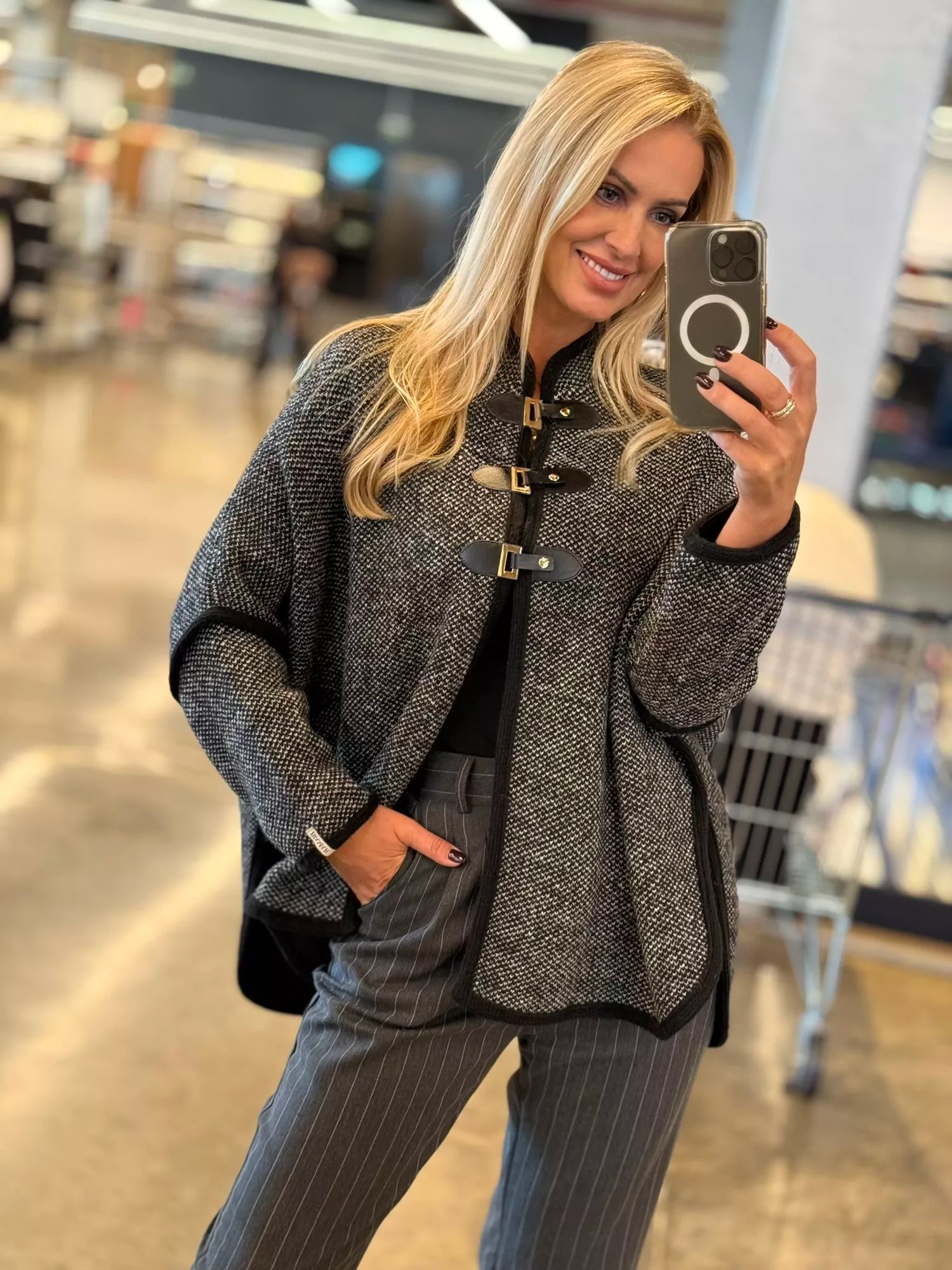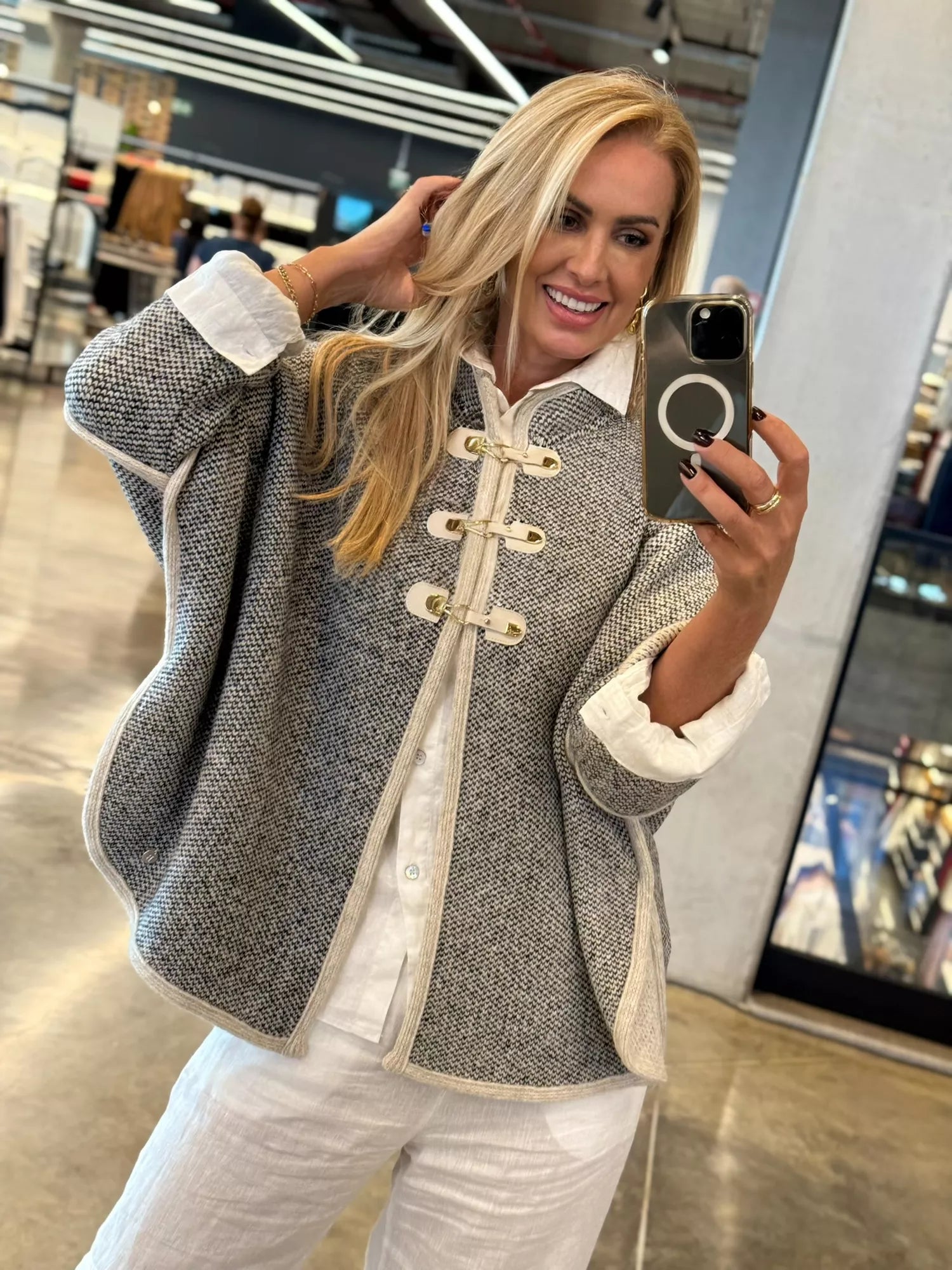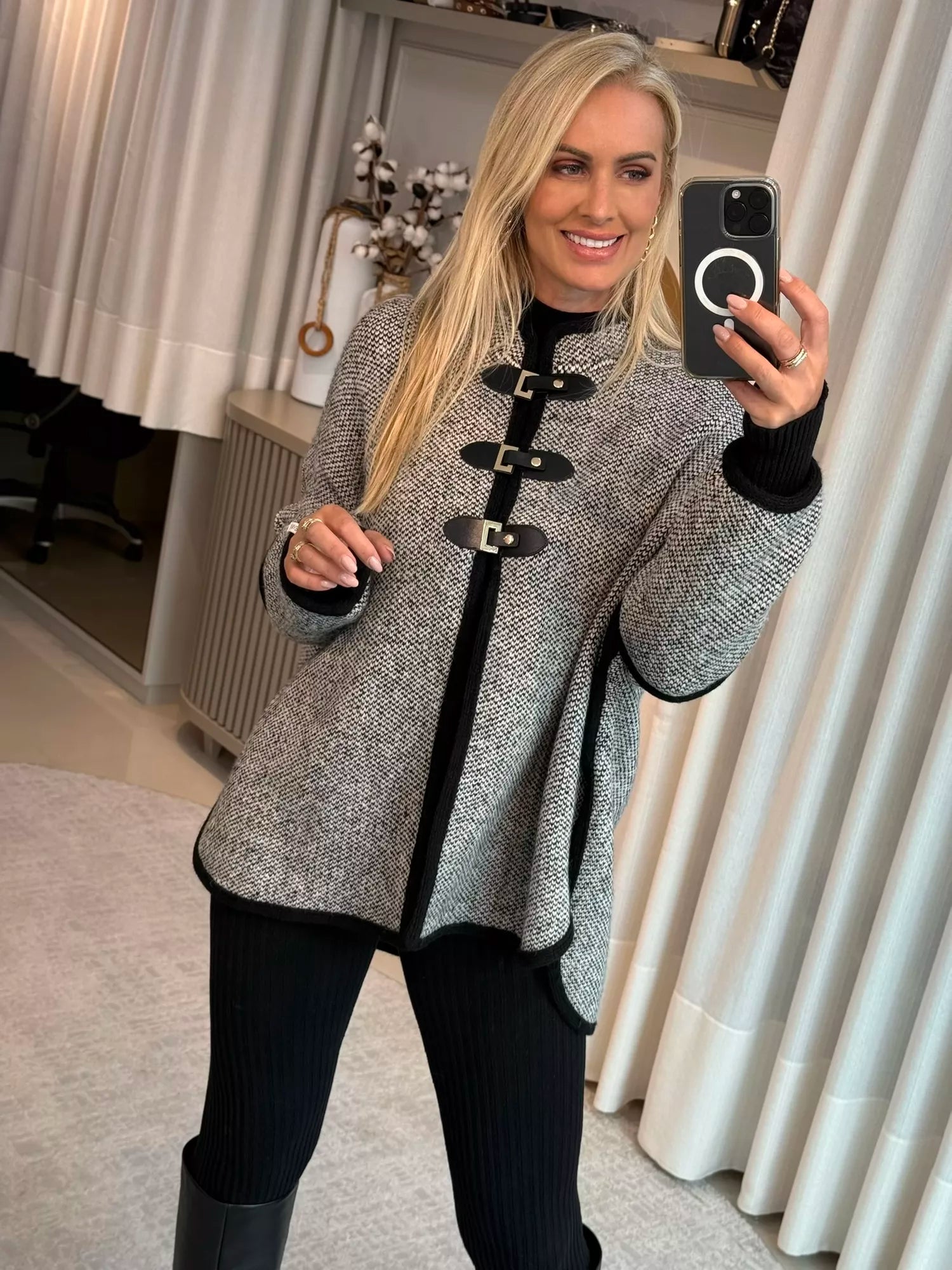 ✔️ Modelagem mullet com caimento moderno: dá movimento e elegância ao look. ✔️ Detalhes em courino e fechos dourados: sofisticação nos acabamentos que fazem a diferença. ✔️ Cava quadrada nas mangas: toque de estilo único e original. ✔️ Peça coringa para qualquer idade: eleva produções com calça, jeans, vestidos ou botas. ✔️ Estilo sem esforço: a capa Biamar 2025 faz o look inteiro brilhar.