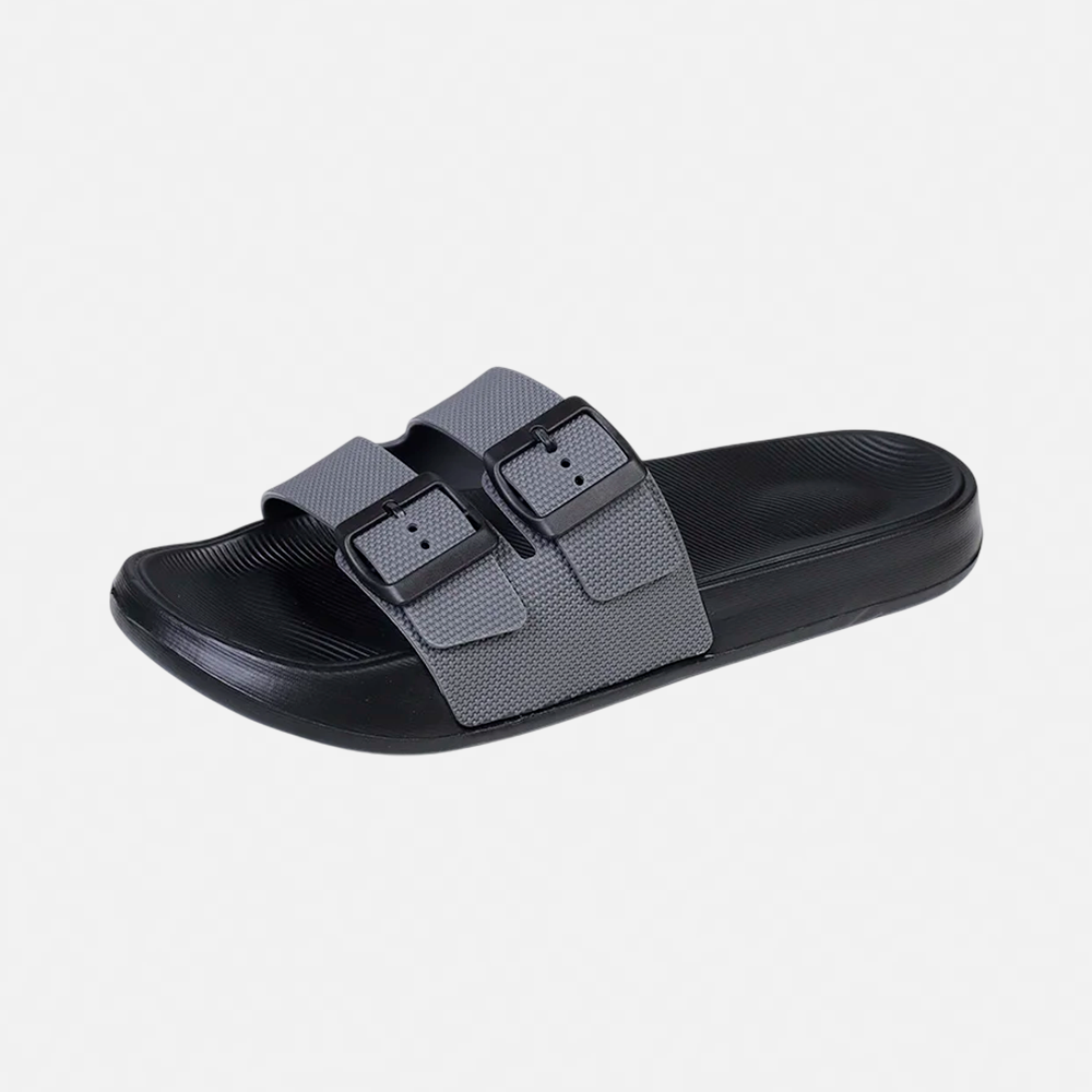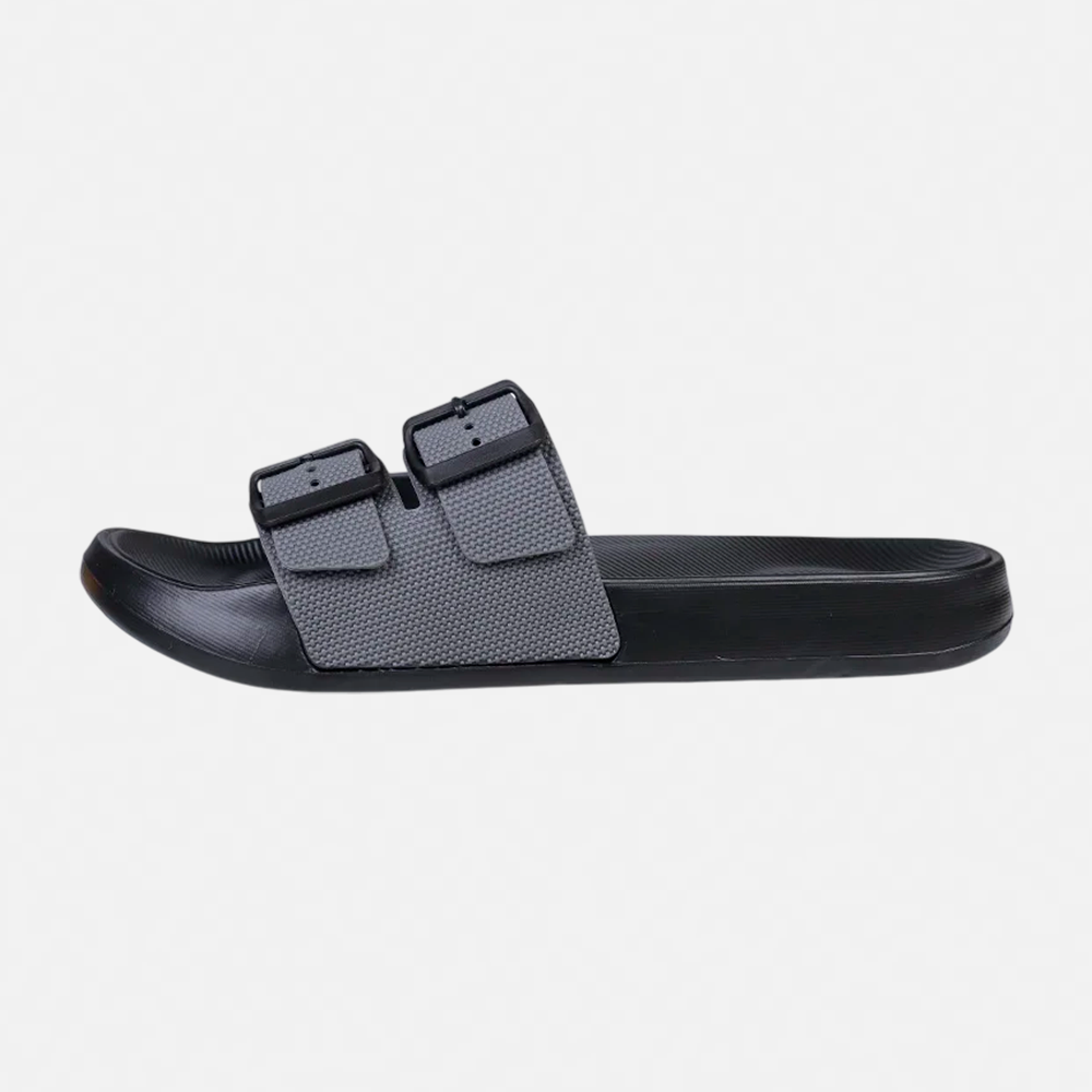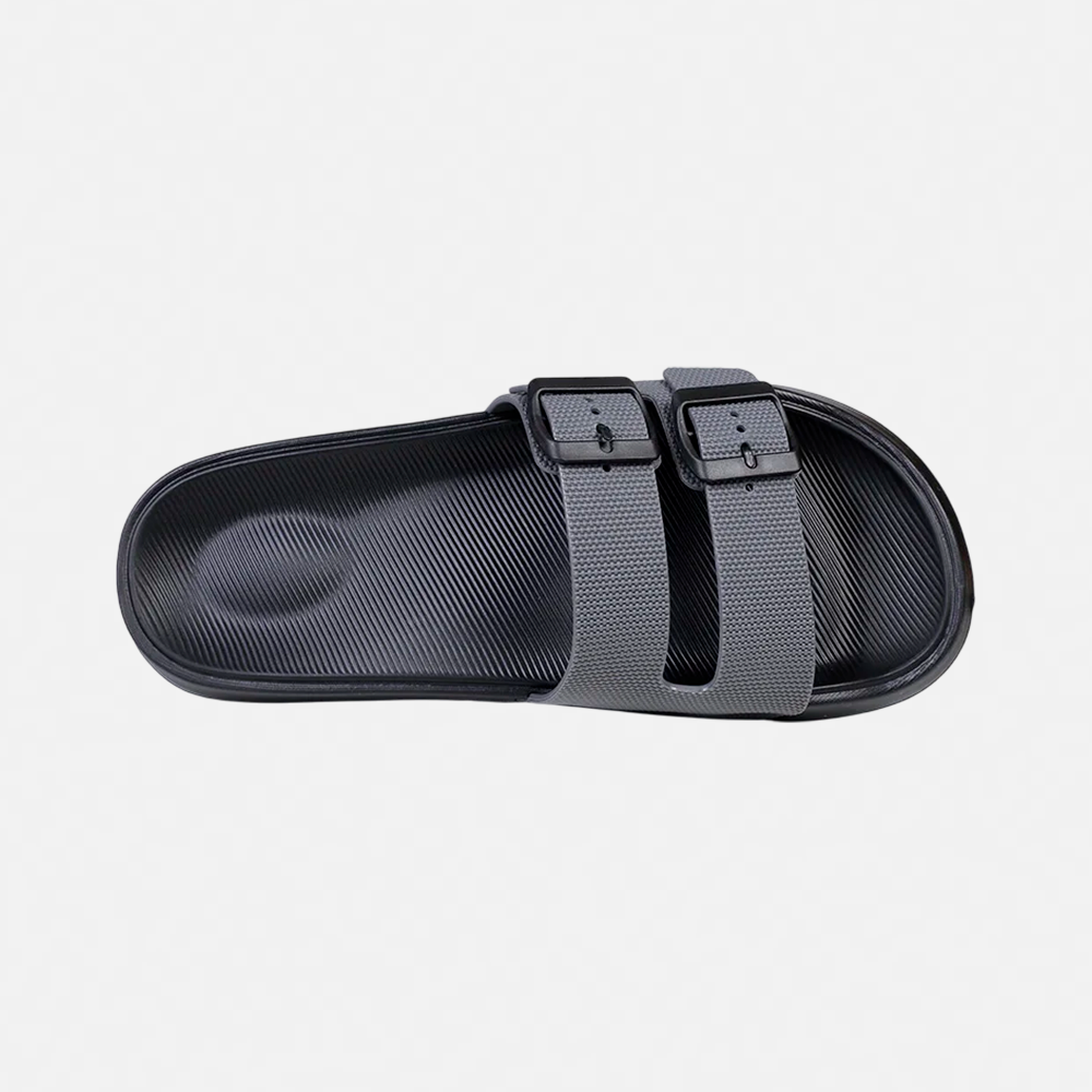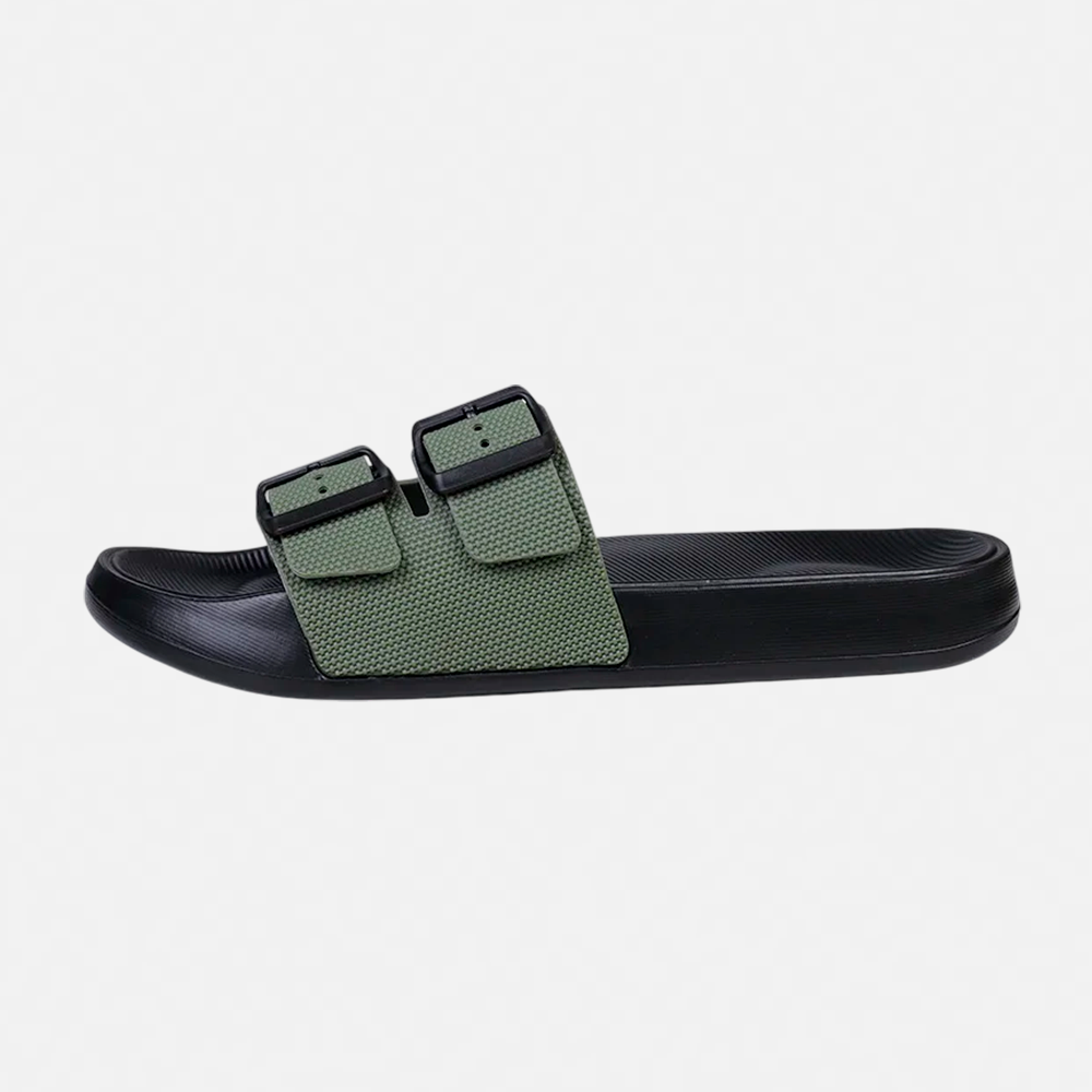 Estilo: casual técnico, com apelo esportivo e visual limpo Solado: borracha com ranhuras discretas, garantindo leveza e tração Material: EVA expandido de alta densidade, leve, impermeável e flexível Design: estrutura monobloco com acabamento texturizado e estética minimalista Tiras: duas tiras com textura geométrica e fechamento ajustável com fivelas tonais Resistência: indicada para ambientes internos e externos; resiste à água, calor e areia Palmilha: anatômica, com leve texturização para melhor encaixe e aderência dos pés Indicação de uso: dias quentes, praia, piscina, pós-treino ou composições casuais modernas Cores disponíveis: cinza e verde