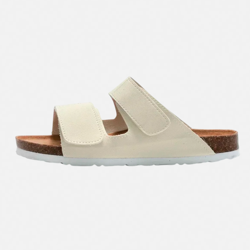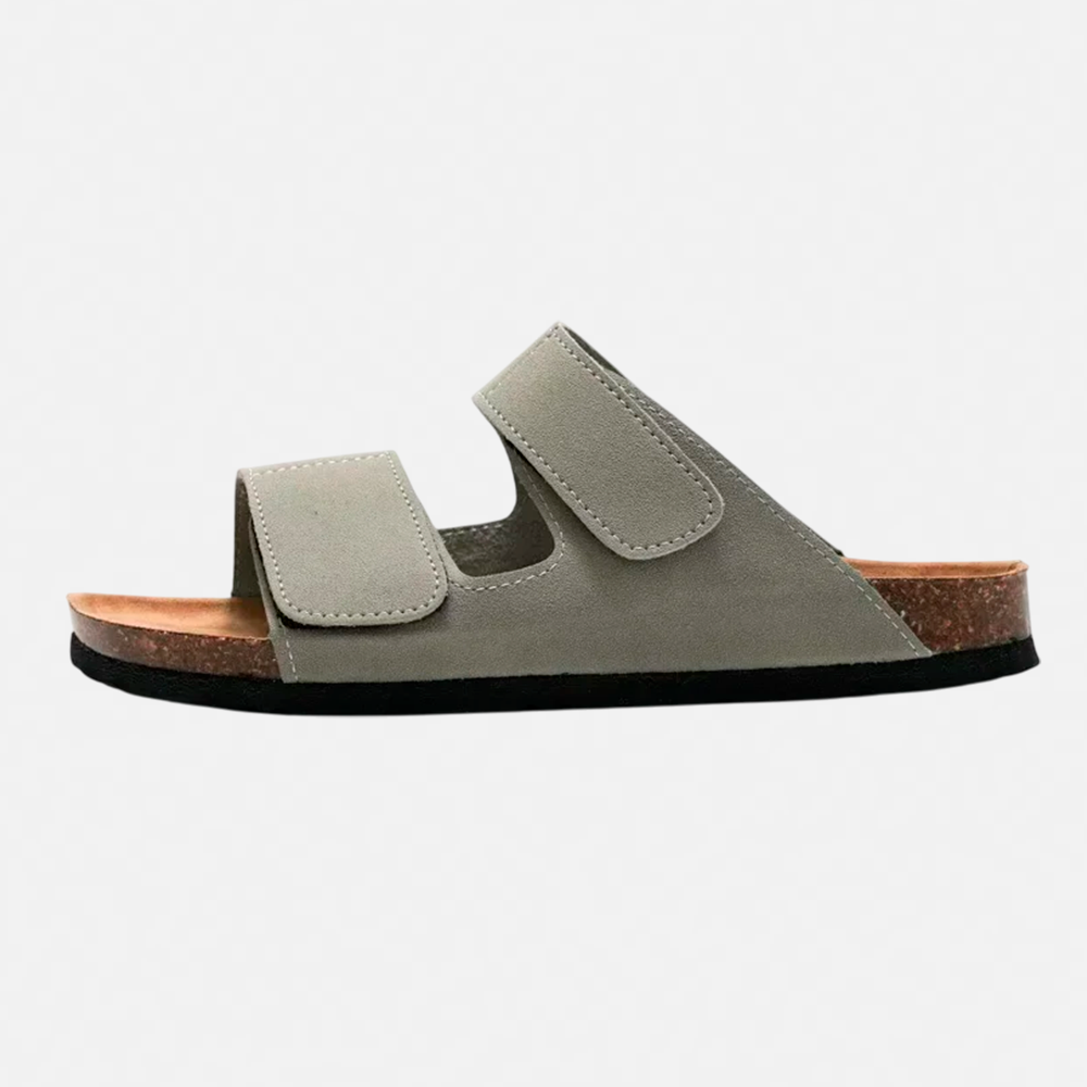Solado: borracha leve e flexível com aderência antiderrapante Cabedal: couro sintético com acabamento fosco e toque macio Fechamento: ajuste personalizado por duas tiras largas com velcro ajustável Forro interno: respirável, evita aquecimento e proporciona sensação de leveza contínua Ergonomia: design que respeita o formato natural dos pés e favorece o alinhamento postural Indicação de uso: dias quentes, pós-praia, viagens, descanso urbano ou momentos de lazer com estilo Palmilha: anatômica, moldada em cortiça natural com camada interna macia para maior conforto ao caminhar Estilo: casual sofisticado, ideal para composições com calças de linho, bermudas neutras ou visuais descontraídos Cores disponíveis: azul marinho, preta, cinza e branca